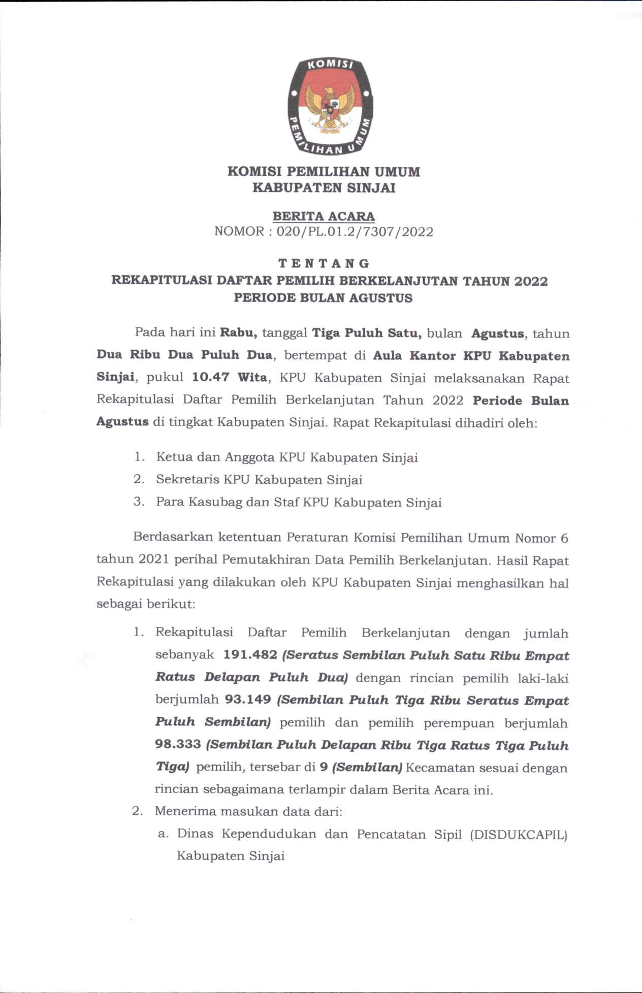 Berdasarkan ketentuan Peraturan Komisi Pemilihan Umum Republik Indonesia Nomor 6 Tahun 2021 tentang Pemutakhiran Data Pemilih Berkelanjutan Tahun 2021, hasil Rapat Pleno yang dilakukan oleh KPU Kabupaten Sinjai menghasilkan hal sebagai berikut: