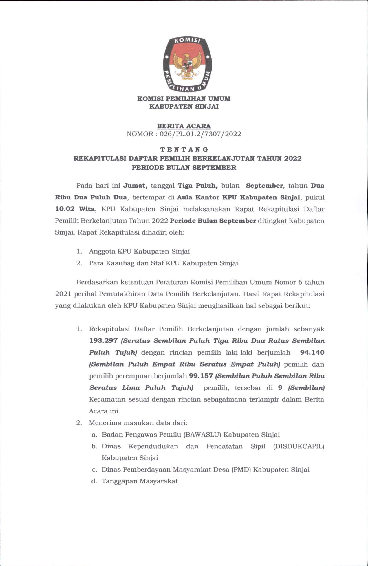Rekapitulasi jumlah pemilih di Sinjai sebanyak 193.297 orang dengan rincian pemilih laki-laki sebanyak 94.140 orang dan pemilih perempuan sebanyak 99.157 orang yang tersebar di sembilan kecamatan sebagaimana terlampir dalam Berita Acara di bawah ini :