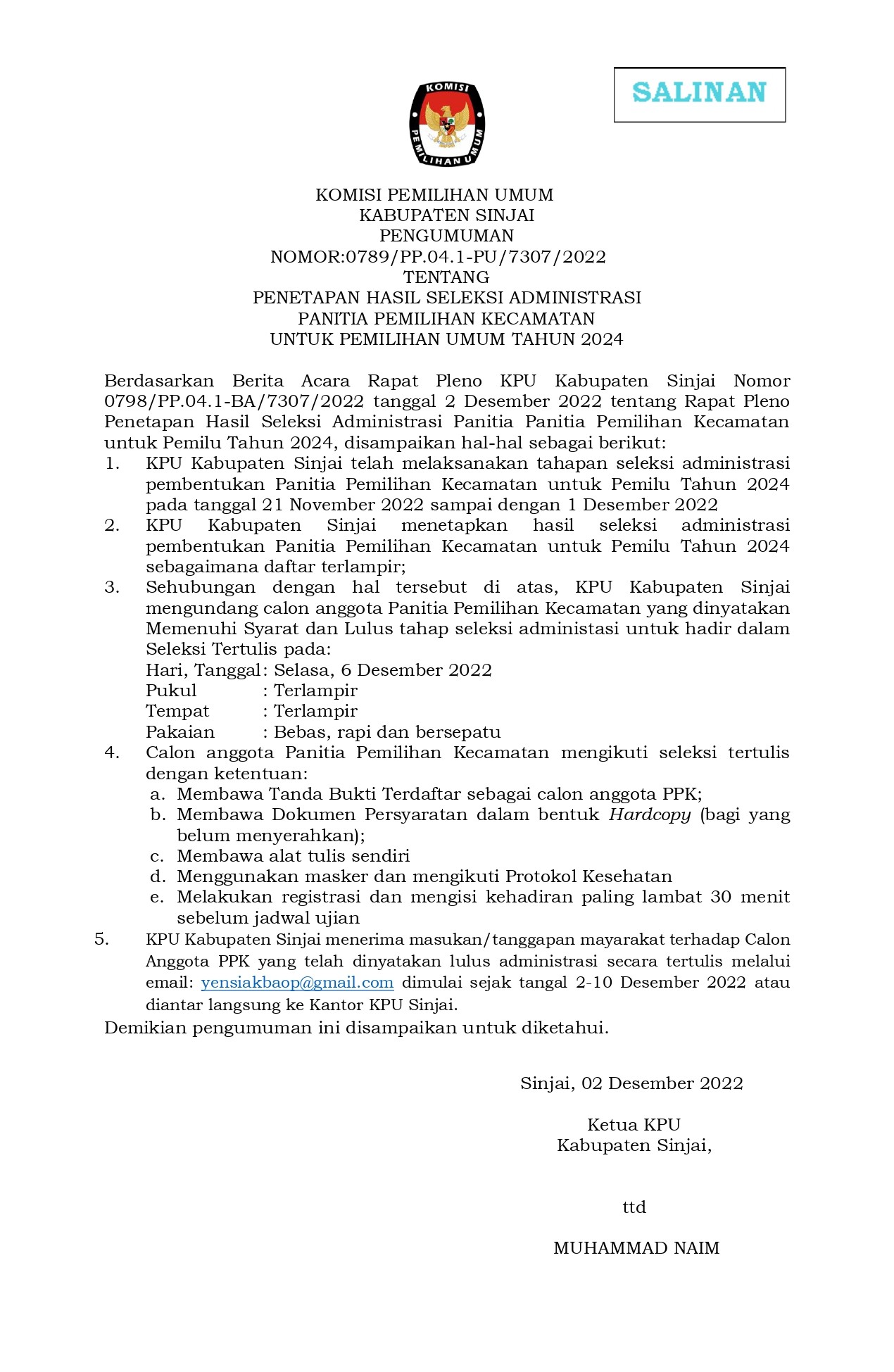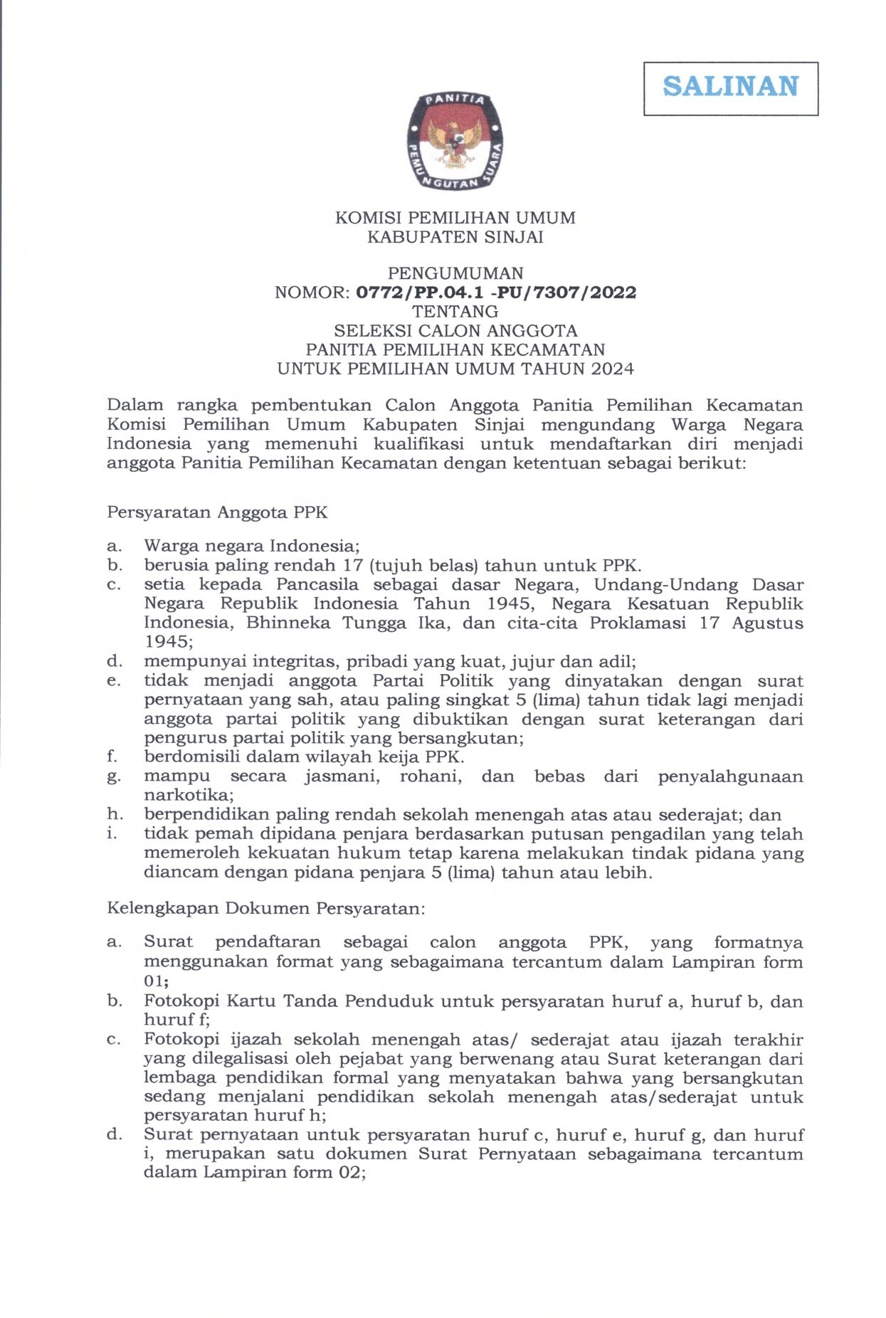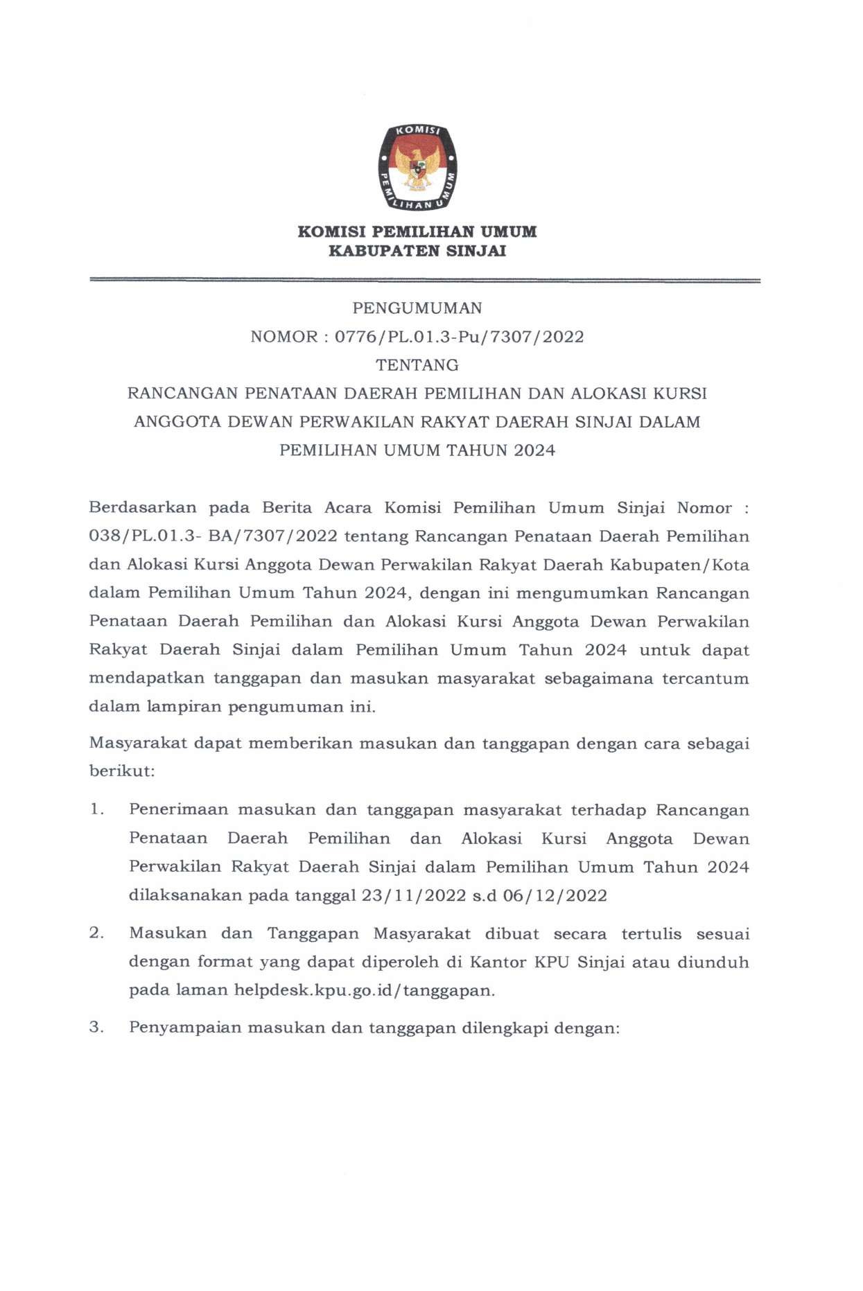 Sinjai- KPU Kabupaten Sinjai mengumumkan Daftar Pemilih Berkelanjutan Periode Bulan September 2022, jumat (30/9/2022).