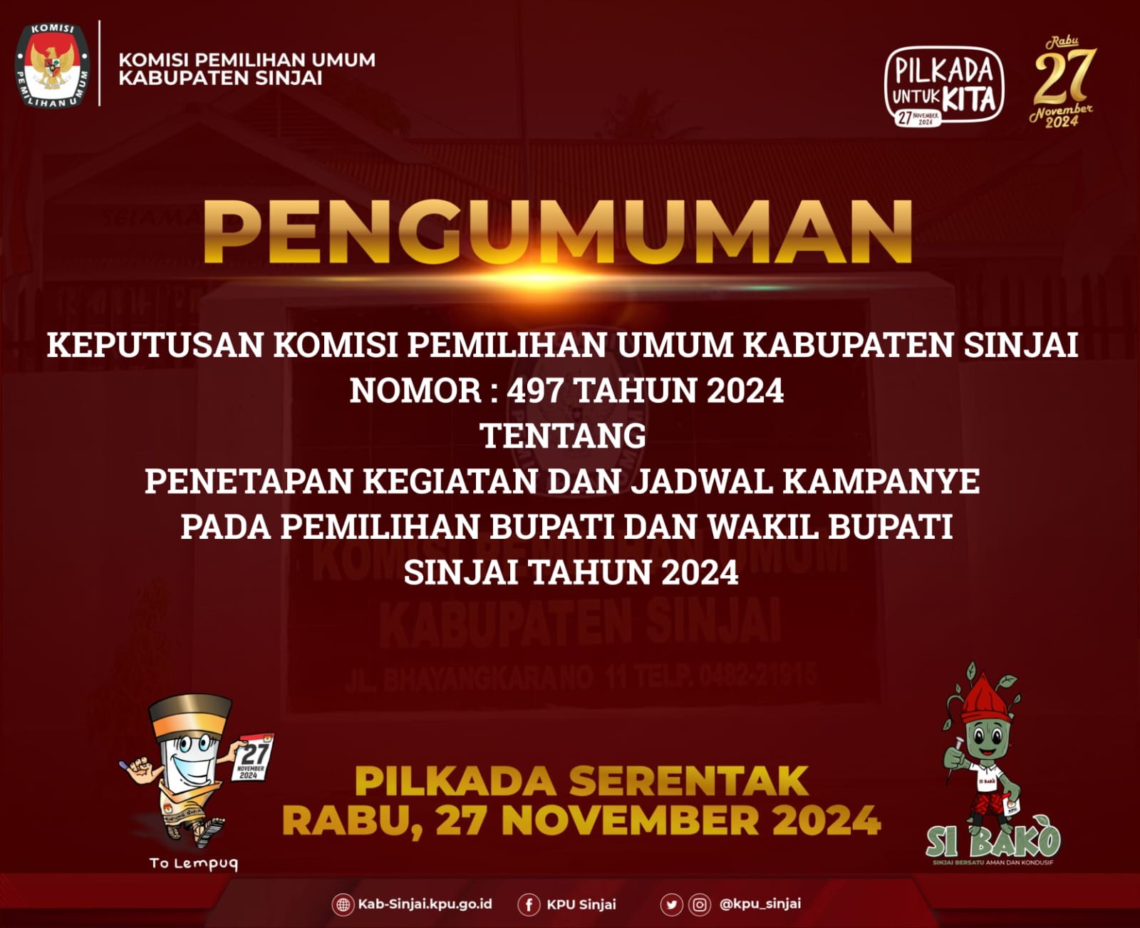 Keputusan Komisi Pemilihan Umum Kabupaten Sinjai Nomor : 497 TAHUN 2024 Tentang Penetapan Kegiatan dan Jadwal Kampanye pada Pemilihan Bupati dan Wakil Bupati Sinjai Tahun 2024 Klik disini