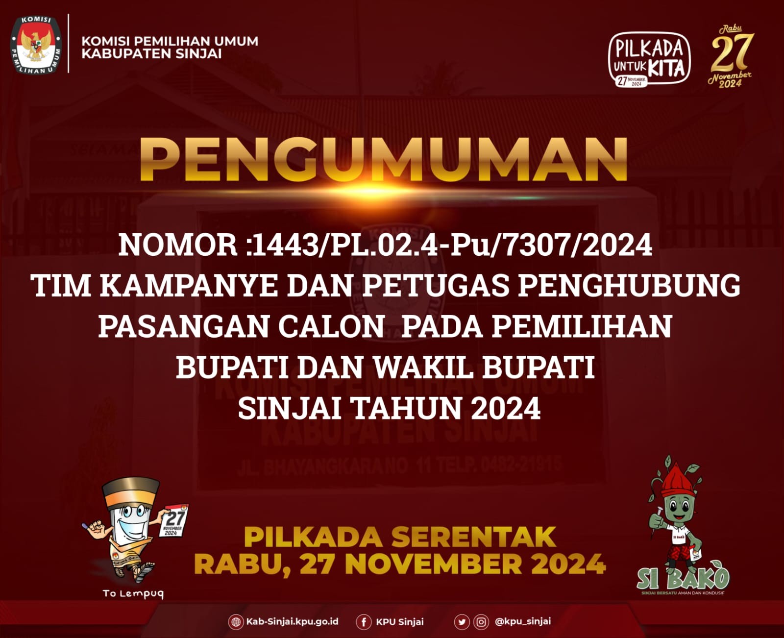 Pengumuman Nomor : 1443/PL.02.4-Pu/7307/2024 tentang Tim Kampanye dan Petugas Penghubung Pasangan Calon pada Pemilihan Bupati dan Wakil Bupati Sinjai Tahun 2024 Klik disini