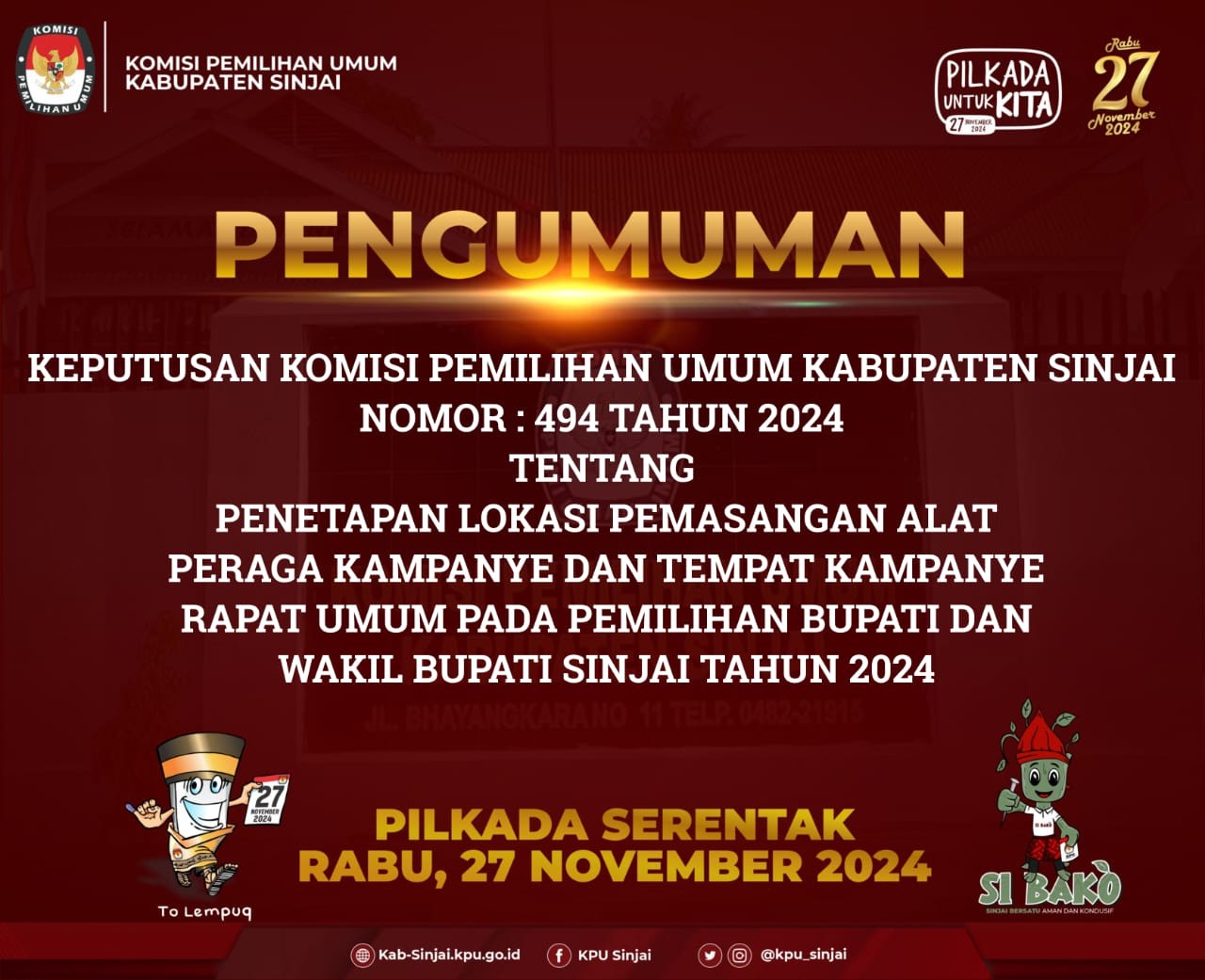 Keputusan Komisi Pemilihan Umum Kabupaten Sinjai Nomor : 494 Tahun 2024 tentang Penetapan Lokasi Pemasangan Alat Peraga Kampanye dan Tempat Kampanye Rapat Umum pada Pemilihan Bupati dan Wakil Bupati Sinjai Tahun 2024 Klik disini