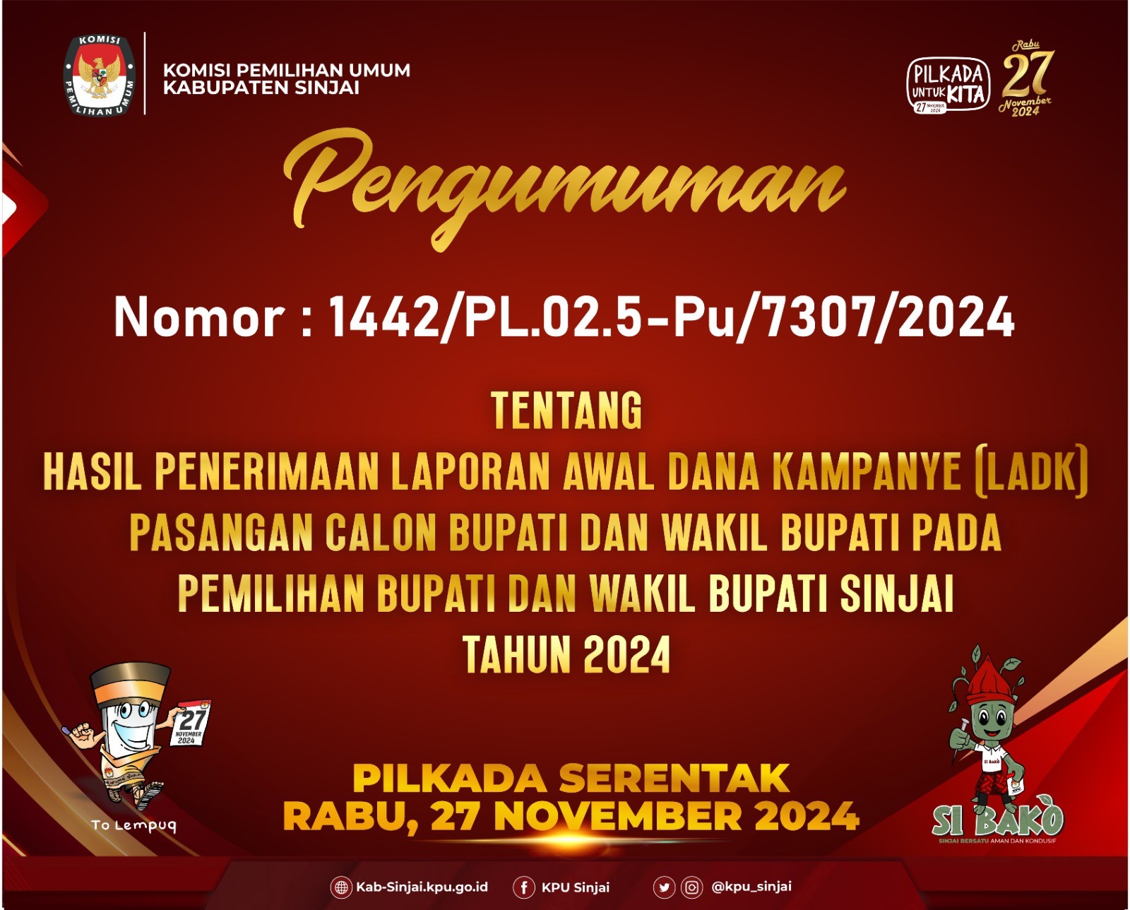 Komisi Pemilihan Umum Kabupaten Sinjai telah mengumumkan hasil penerimaan laporan awal dana kampanye (LADK) pasangan calon Bupati dan Wakil Bupati Sinjai Tahun 2024, informasi selengkapnya klik disini