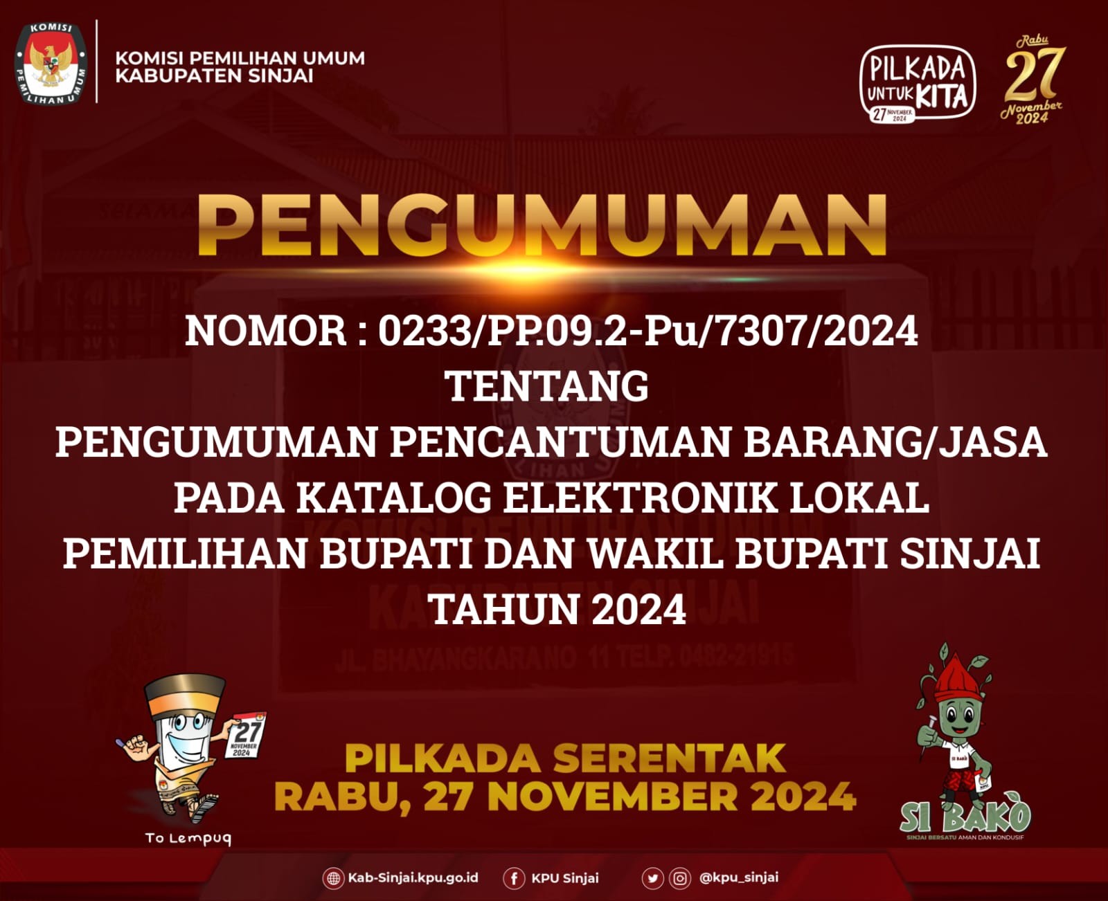 Pengumuman Nomor : 0233/PP.09.2-Pu/7307/2024 tentang Pencatuman Barang/Jasa pada Katalog Elektronik Lokal Pemilihan Bupati dan Wakil Bupati Sinjai Tahun 2024 Klik disini